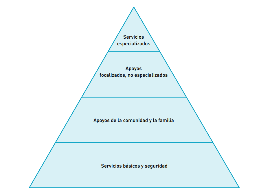 - Nivel 1: Servicios básicos y seguridad. La base de la pirámide se centra en promover el bienestar de toda la población. Para ello se propone que, desde todos los sectores de acción humanitaria, se adopten consideraciones clave para que su asistencia sea digna, segura y culturalmente apropiada.